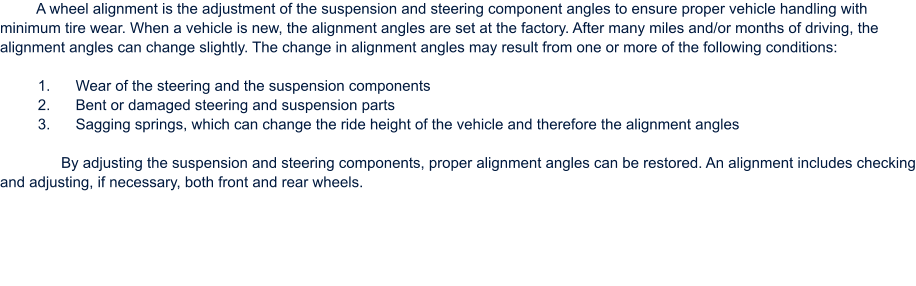 A proper wheel alignment will improve tire life, vehicle performance and fuel efficiency.